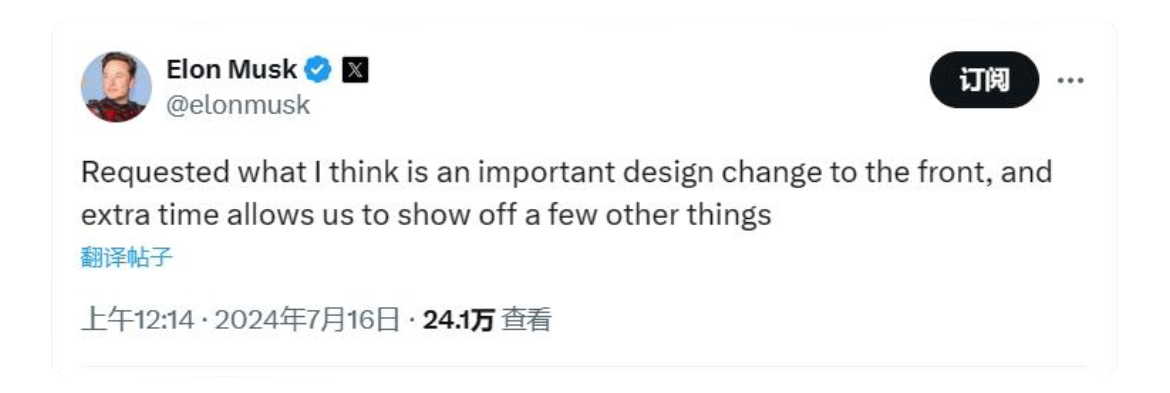 他在社交媒体X上回应称:“我要求对Robotaxi前部进行重要设计更改,因推迟发布日期而得来的额外时间将让公司有机会展示一些其他的内容。”
